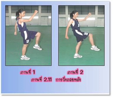 1.2.1 ก้าวเท้าแรกไปด้านหลัง โดยก้าวเท้าสั้นๆ 1.2.2 ก้าวหลังก้าวตาม สลับเท้าซ้าย – ขวา อย่างรวดเร็ว 1.2.3 น้ำหนักตัวอยู่ระหว่างเท้าทั้งสอง ลำตัวตั้งตรง 1.2.4 ย่อเข่าลงเล็กน้อยเพื่อพร้อมจะหยุด
