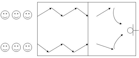 1. ให้นักเรียนเข้าแถวแบ่งเป็น 2 แถวดังภาพ 2. ฝึกปฏิบัติการวิ่ง เปลี่ยนทิศทาง หมุนตัว และกระโดดที่จุด A , B และ C แบบฝึกที่ 3 แบบฝึกการกระโดด