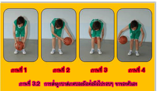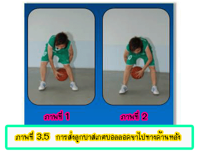4. การส่งลูกบาสเกตบอลลอดขาไปทางด้านหลัง มีวิธีปฏิบัติดังนี้ 4.1 ยืนแยกเท้าประมาณช่วงไหล่ย่อตัวลง มือถือลูกบอลสองมือเหนือศีรษะ 4.2 ก้มตัวลง ส่งลูกบาสเกตบอลด้วยสองมือให้ลอดขาไปทางด้านหลังให้ลูกสูงขึ้นแล้วหมุนตัวไปรับลูกบอล อย่าให้ลูกตกพื้น