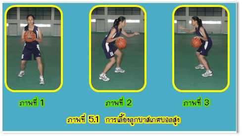 การพาลูกบอลด้วยมือซ้ายและมือขวาเคลื่อนที่ไปส่วนต่างๆ ของสนามโดยไม่ผิดกติกา การเลี้ยงลูก บาสเกตบอล เป็นการช่วยให้เกมการเล่นสนุกสนาน และเป็นทักษะที่สำคัญประจำตัวของนักกีฬา ซึ่งจะต้องฝึก ให้ชำนาญคล่องแคล่วว่องไว และเหมาะสมกับสถานการณ์การเล่น เช่น การเลี้ยงลูกเร็ว การเลี่ยงลูกสูงหรือต่ำ เป็นต้น การเลี้ยงลูกบาสเกตบอลสูง (High Dribbling) ![]() การเลี้ยงลูกบาสเกตบอล เป็นการหลบหลีกฝ่ายตรงข้ามเพื่อไม่ให้แย่งบอล หรือการปรับเปลี่ยนตำแหน่ง ของการเล่น เพื่อให้มีประสิทธิภาพของการเล่นทีมให้ดียิ่งขึ้นโดยต้องใช้ทักษะการเลี้ยงลูกบาสเกตบอล หลายวิธี ด้วยกันการเลี้ยงลูกบาสเกตบอลสูงหรือการพาลูกบอลเคลื่อนที่เร็วจะทำได้ก็ต่อเมื่อผู้ครอบครองบอลมีพื้นที่ กว้างมากพอ ซึ่งเป็นการทำให้สามารถเคลื่อนที่ไปข้างหน้าได้อย่างรวดเร็ว อาจพูดได้ว่า ถ้าไม่มีการเลี้ยงหรือ พาบอลเคลื่อนที่เกมรุก ก็ไม่เกิดขึ้นจริงอยู่ถึงแม้การส่งจะสามารถสร้างเกมรุกได้ แต่ถ้าฝ่ายรุกถูกปิดเส้นทางการรับบอลผู้ส่งย่อมส่งไม่ได้ จึงจำเป็นอย่างยิ่ง จะต้องพาลูกบอลเคลื่อนที่หรือเลี้ยงเพื่อหาจังหวะส่งลูกบอลให้เพื่อนร่วมทีม ดังนั้นการเลี้ยง หรือการพาบอลเคลื่อนที่ จึงต้องฝึกฝนอยู่เสมอเพราะการเล่นทีมในปัจจุบันฝ่ายป้องกันมีรูปแบบการป้องกันที่ สามารถสกัดกั้นการรับและส่งลูกบอลมากขึ้น ทำให้การเลี้ยงลูกบอล สูงหรือการพาลูกบอล เคลื่อนที่เร็ว มีความจำเป็นมากขึ้น การเลี้ยงลูกบาสเกตบอลสูงมีวิธีปฏิบัติดังนี้ 1. ลำตัวโน้มไปข้างหน้าเล็กน้อย ศีรษะตั้งตรง สายตามองจุดหมายข้างหน้า 2. กางนิ้วมือออก บังคับลูกบอลด้วยข้อมือและปลายนิ้วมือ 3. ผลักลูกบอลลงสู่พื้นให้กระดอนขึ้นไม่เกินระดับอก 4. เท้าเคลื่อนที่ตามไปอย่างรวดเร็ว โดยการผลักลูกบอลไปข้างหน้า ![]() ![]() การเลี้ยงลูกบาสเกตบอลต่ำ (Low Dribbling) ![]() การเลี้ยงลูกบอลต่ำมีเป้าหมายเพื่อการครอบครองบอลไว้จากการป้องกัน และบางครั้งก็จำเป็นต้องใช้เพื่อ การหลบหลีกคู่ต่อสู้ การหลบหลีกทำได้หลายวิธี บางวิธีก็ง่าย บางวิธีก็ยากต่อการฝึก วิธีที่ยากอาจจะมีการเสี่ยง ต่อการเสียการครอบครองลูกบอล เช่น การเลี้ยงลูกบอลต่ำ โดยลอดระหว่าง เท้าหรือตวัดอ้อมด้านหลัง เป็นต้น แต่ถ้าผู้สอนได้แนะนำให้ถูกวิธี ถูกขั้นตอน และฝึกฝนบ่อยๆ จนเกิดความชำนาญแล้วอัตราการเสี่ยงก็ลดน้อยลง ทั้งยังเป็นการเพิ่มคุณค่าของผู้เล่นให้มีความสามารถสูงขึ้น การที่ผู้เล่นมีความสามารถในการเลี้ยงลูก หลบหลีก ได้หลายๆ วิธี ก็มิใช่ว่าจะหลบหลีกได้ผลทุกครั้งไป