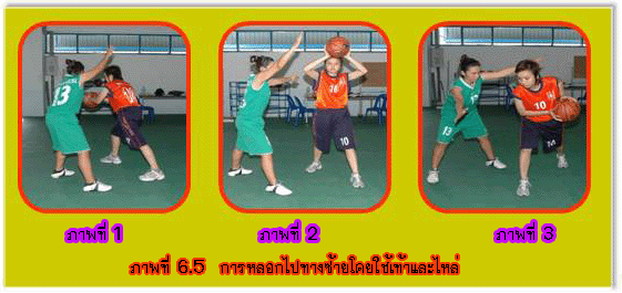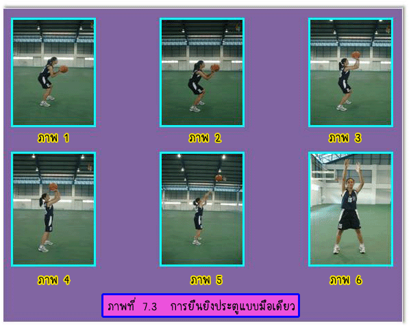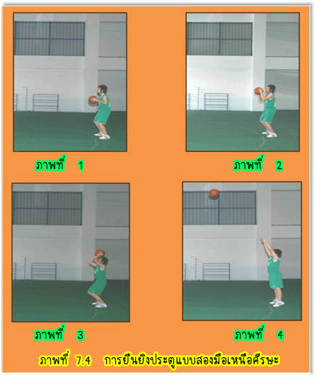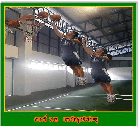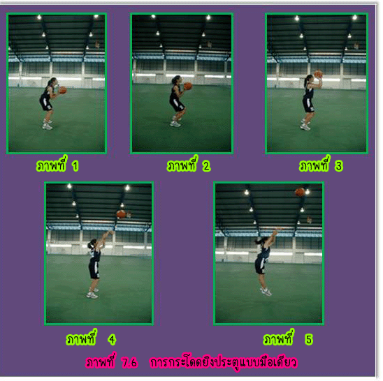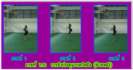 1.3 การยืนยิงประตูแบบสองมือระดับอก (Two Hands Set Shot) มีวิธีปฏิบัติดังนี้ 1.3.1 ยืนแยกเท้าเท่าช่วงสะโพก ปลายเท้าเสมอกัน หรือเหลื่อมกันเล็กน้อยก็ได้ ![]() 2.1 การกระโดดยิงประตูแบบมือเดียว (7-6) ความมุ่งหมายของการกระโดดยิงประตูก็คือ ผู้ยิงต้องการจะให้ได้ความสูงเพิ่มขึ้น จะได้พ้นจากการถูก ปัดลูกจากฝ่ายป้องกันและเพื่อความแม่นยำขึ้นอีก โดยเฉพาะผู้ที่กระโดดได้สูงโอกาสที่ใช้การกระโดดยิงประตูอยู่กับที่บ่อยครั้ง ที่สุดคือขณะที่ฝ่ายป้องกันตั้งรับแบบเป็นเขต(Zone) อย่างเหนียวแน่นจนไม่สามารถรุกโจมตี เข้าถึงเขตฝ่ายป้องกันได้การกระโดดยิงประตูแบบมือเดียวมีวิธีปฏิบัติดังนี้ 2.1.1 ตามองที่ขอบห่วง ณ จุดใกล้ตาที่สุด 2.1.2 จับบอลมาไว้หน้าลำตัวด้วยมือทั้งสองข้าง 2.1.3 ยืนปลายเท้าเสมอกันหรือเหลื่อมกันเล็กน้อย โดยเท้าขวาควรอยู่ด้านหน้า 2.1.4 กระโดดถีบตัวขึ้นเต็มที่พร้อมทั้งยกบอลชูขึ้นเหนือหน้าฝากด้วยมือขวา ซึ่งรองรับอยู่ด้านใต้ หลังลูก หงายข้อมือขึ้น มือซ้ายช่วยประคองลูก อยู่ด้านข้างลูกบอลหรือใต้ลูกบอลด้านหน้า 2.1.5 เมื่อกระโดดลอยตัวถึงจุดสูงสุด จะปล่อยมือซ้ายออกพร้อมเหยียดศอก สะบัดข้อมือส่งลูก บอลออกไปด้วยกำลังของข้อมือขวา และปลายนิ้วบังคับให้ลูกบอลหมุนกลับเหยียดแขนตามลูกบอลไป 2.1.6 ถ้ายิงไกลห่วงต้องบังคับให้วิถีลูกโค้งย้อยปานกลางถ้าใกล้ห่วงประตูควรใช้วิธีกระทบกระดาน หลัง หมายเหตุ การกระโดด ยิงประตูด้วยมือซ้ายปฏิบัติตรงข้ามกับมือขวา ![]() 2.2 การวิ่งกระโดดยิงประตู (Lay up Shot) ![]() 3. การยิงประตูแบบตวัดมือ (Hook Shot) เพื่อการยิงลูกให้ได้ผลดี ความเร็ว จังหวะ และความสัมพันธ์เป็นสิ่งสำคัญ ดยมีวิธีปฏิบัติคือ ก้าวเท้าซ้าย ให้เต็มก้าวพร้อมกับกระโดดขึ้นให้สูง ตามองดูห่วงประตู ครอบครองลูกให้ดี ใช้มือขวาตวัดลูกไปสู่ห่วงประตู บังคับลูกให้ออกทางปลายนิ้ว มืออย่าให้ออกทางด้านข้างมือ มือซ้ายยกสูงขึ้นเพื่อป้องกันการปัดลูกจากคู่ต่อสู้ ลงพื้น ในท่าการทรงตัวเพื่อแย่งลูกต่อไป ![]() ![]() การหมุนตัวยิงประตู (Turn Shot) การหมุนตัวยิงประตูเกิดขึ้นเมื่อผู้เล่นฝ่ายรุกครอบครองลูกบอลใกล้ห่วงประตูและมีฝ่ายป้องกันมาทำการป้องกัน ผู้เล่นสามารถใช้วิธีหมุนตัวเพื่อยิงประตูได้ การยิงประตูอาจจะใช้วิธีคว่ำมือหรือหงายมือก็ได้ มีวิธีการปฏิบัติดังนี้ 1. เริ่มจากผู้เล่นครอบครองบอล ใช้เท้าตรงข้ามเท้าหลัก ก้าวหมุนตัวหลบหลีกผู้ป้องกัน 2. กระโดดขึ้นยิงประตูด้วยวิธีคว่ำมือ หงายมือ หรือด้วยลูกตวัด ![]() การปัดลูกยิงประตู (Tap the Ball for Shooting) ![]() การปัดลูกยิงประตู เป็นการใช้แรงจากมือเดียวหรือสองมื
