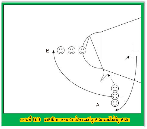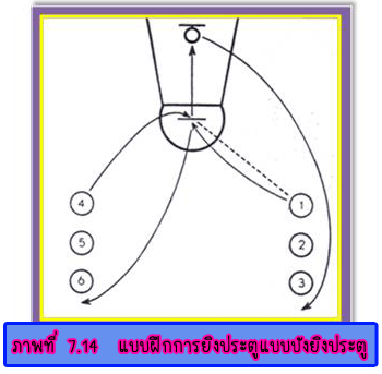1. ตั้งแถวตอนสามแถวดังรูป 2. (1) ส่งลูกบอลให้ (4) แล้ววิ่งตัดหน้า (4) ขณะเดียวกัน (7) วิ่งตัดหน้า (4) แต่ต้องให้ (1) ตัดหน้า ไปก่อน 3. (4) ส่งลูกบอลให้ (1) หรือ (7) ยิงประตู 4. (7) ไปต่อท้ายแถวที่ยืนอยู่ในหัวกะโหลก 5. (1) วิ่งมาต่อท้ายแถวทางด้านซ้าย (4) วิ่งมาต่อท้ายแถวทางด้านขวา 6. (1) หรือ (7) ที่ไม่ได้ยิงประตูคอยรับลูกแล้วส่งให้คนต่อไปที่ถัดจาก (4) แบบฝึกที่ 1 จับคู่ยิงประตูใต้ห่วง วิธีปฏิบัติ 1. ให้ผู้ฝึกจับคู่กัน คนหนึ่งเป็นผู้ยิงประตู อีกคนหนึ่งเป็นผู้เก็บลูกบอล 2. ผู้ยิงประตูสามารถเคลื่อนที่ไป ณ.จุดใดก็ได้ใต้ห่วงประตูโดยคู่จะต้องเก็บลูกบอลแล้วส่งให้ตามจุดที่ผู้ยิงประตู เคลื่อนที่ไป เช่น เก็บลูกบอลส่งให้ 3. ปฏิบัติเช่นนี้ 5 - 10 ครั้งแล้วเปลี่ยนกัน
