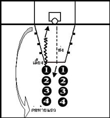 ทักษะการก้าวเท้ายิงประตู ![]() แบบฝึกที่ 4 เลี้ยงลูกบอลอ้อมหลักก้าวเท้ายิงประตู วิธีปฏิบัติ 1. ผู้ฝึกตั้งแถวตอนที่หลังเส้นหลัง ด้ายซ้าย หรือด้านขวาของแป้นบาส 2. ผู้ฝึกคนแรก ( หมายเลข 1 )เลี้ยงลูกบอลไปอ้อมหลักแล้วก้าวเท้ายิงประตู (Lay up shot)เมื่อยิงประตูแล้ว ให้เก็บลูกบอลส่งให้คนที่ 2( หมายเลข 2 ) จากนั้น ไปต่อท้ายแถว 3. ผู้ฝึกคนที่ 2 ( หมายเลข 2 ) และคนต่อๆไป ให้ปฏิบัติเหมือนกับผู้ฝึกคนแรก