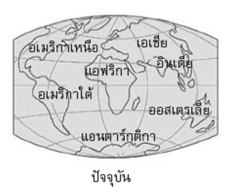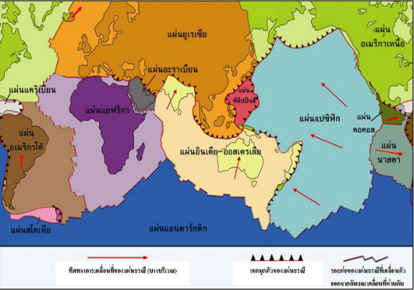 แผ่นธรณีที่สำคัญในปัจจุบัน แผ่นยูเรเซีย แผ่นแปซิฟิก แผ่นอินเดีย-ออสเตรเลีย แผ่นอเมริกาเหนือ แผ่นอเมริกาใต้ แผ่นแอฟริกา แผ่นแอนตาร์กติกา