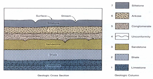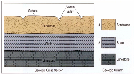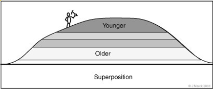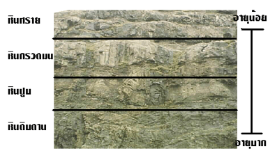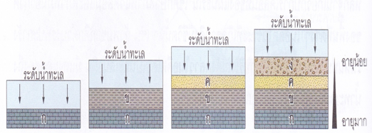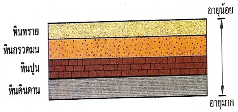 การตกตะกอนของชั้นหิน จะทับถมจากล่างขึ้นบน ชั้นตะกอนที่ตกทับถมก่อนจะเป็นชั้นที่มีอายุมากที่สุด ชั้นหินที่อยู่ถัดขึ้นมามีอายุน้อยขึ้นมาตามลำดับ ชั้นหินที่อยู่บนสุดจะมีอายุน้อยที่สุด