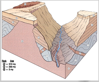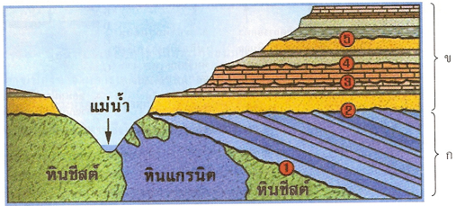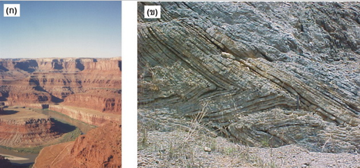 (ก) ชั้นหินที่มีธรรมชาติเดิมวางตัวแนวราบ บริเวณ Grand Canyon, USA