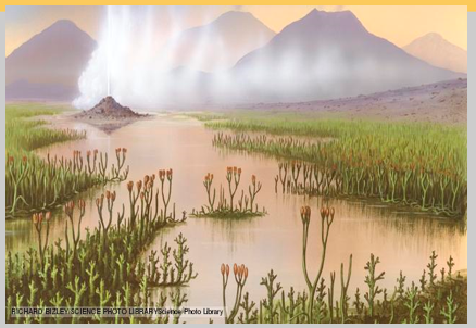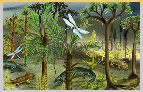 มีเฟิร์นขนาดยักษ์และป่าไม้เจริญเต็มที่ (ให้ถ่านหิน )