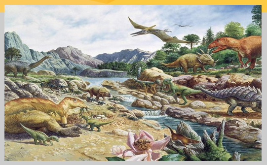 145 - 66 ล้านปี เริ่มมีพันธุ์ไม้ดอก หอยน้ำจืดแพร่หลาย ยังคงมีไดโนเสาร์ในตอนปลายยุค ไดโนเสาร์และแอมโมนอยด์เริ่มสูญพันธุ์