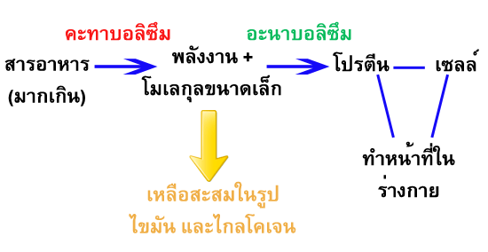 เมตาบอลิซึม คือกระบวนการที่เกิดขึ้นภายในเซลล์ ซึ่งสามารถจำแนกออกเป็น 2 ประเภทใหญ่ๆ ได้ดังนี้ 1. กระบวนการสังเคราะห์พลังงานจากอาหารที่เรารับประทานเข้าไป เช่น สังเคราะห์เอากรดอะมิโนกับกลูโคส จากคาร์โบไฮเดรต ซึ่งปฏิกิริยาที่เกี่ยวข้องกับการสังเคราะห์นี้เรียกว่า ปฎิกิริยาอะนาบอลิก โดยมีจะมีการสร้างโมเลกุลใหญ่ๆขึ้นมา เช่น โปรตีนกับไกลโคเจน แล้วนำไปเก็บไว้ที่ตับและกล้ามเนื้อต่างๆ (เก็บสำรองไว้) 2. กระบวนการสลาย คือการสลายโมเลกุลใหญ่ในข้อ 1 ที่เก็บสำรองไว้นั้น ให้ไปเป็นโมเลกุลเล็ก เพื่อนำไปใช้เป็นพลังงานได้ทันที พลังงานที่ว่านี้ก็คือเรี่ยวแรงที่นำไปใช้ในการออกกำลังกาย ยืน เดิน นั่ง ต่างๆนั่นเอง หมายความว่า มีการสำรองไว้ตามข้อ 1 ก่อน จากนั้น เมื่อไรที่ร่างกายต้องการใช้ ก็จะเข้าสู่ข้อ 2. คือสลายของที่ได้จากข้อ 1. เพื่อนำมาเป็นพลังงานนั่นเองครับ ขอบคุณที่มาเนื้อหาเพิ่มเติม http://www.tuvayanon.net/M-ep6-001001A-570623-2154.html