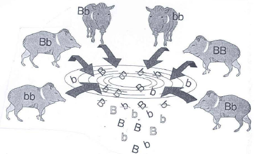 ยีนพูล (gene pool) ประชากร หมายถึง กลุ่มของสิ่งมีชีวิตที่อาศัยอยู่รวมกันในพื้นที่หนึ่งๆ โดยสมาชิกในประชากรของสิ่งมีชีวิตนั้นสามารถสืบพันธุ์ระหว่างกันได้และให้ลูกที่ไม่เป็นหมัน ในประชากรหนึ่งๆ จะประกอบด้วยสมาชิกที่มียีนควบคุมลักษณะต่างๆจำนวนมาก ยีนทั้งหมดที่มีอยู่ในประชากรในช่วงเวลาหนึ่ง เรียกว่า ยีนพูล (gene pool) ซึ่งประกอบด้วย แอลลีล (alleele) ที่เป็นองศ์ประกอบทางพันธุกรรมของประชากร และปัจจัยที่ทำให้ความถี่ของแอลลีเปลี่ยนแปลง สิ่งที่น่าสนใจคือเราจะศึกษาความถี่ของแอลลีลในประชากรได้อย่างไร การหาความถี่ของแอลลีลในประชากร จากบทเรียนที่ผ่านมานักเรียนได้ทราบแล้วว่าในสิ่งมีชีวิตที่เป็นดิพลอยด์ในแต่ละเซลล์มีจำนวนโครโมโซมเพียง 2 ชุดและแต่ละยีนจะมี 2 แอลลีล ดังนั้นถ้านักเรียนรู้จำนวนจีโนไทป์แต่ละชนิดของประชากรนักเรียนจะสามารถหา ความถี่ของจีโนไทป์ (genotype frequency) และความถี่ของแอลลีลในประชากรได้จากตัวอย่างดังนี้ จากรูป ยีนพูลของประชากรสัตว์ชนิดหนึ่ง ประกอบด้วยแอลลีลทุกแอลลีลของยีนแต่ละยีน ในภาพแสดงความถี่ของแอลลีล B และ แอลลีล b โดยแอลลีลเหล่านี้มาจากสมาชิกที่มีจีโนไทป์ต่างกัน 3 แบบ คือ BB Bb และ bb