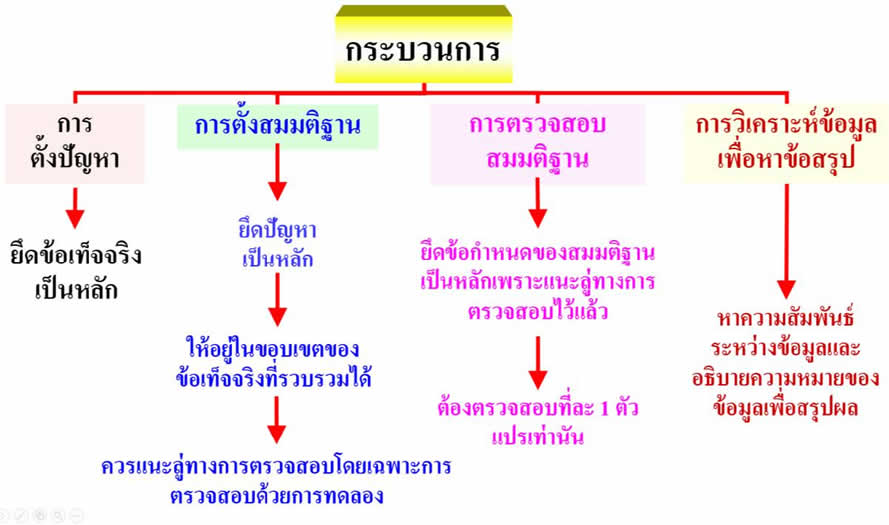 1. กระบวนการ (Process) -> เทคนิคกรรมวิธีในการสืบเสาะหาความรู้ ซึ่งประกอบด้วย 4 ขั้นตอนคือ
