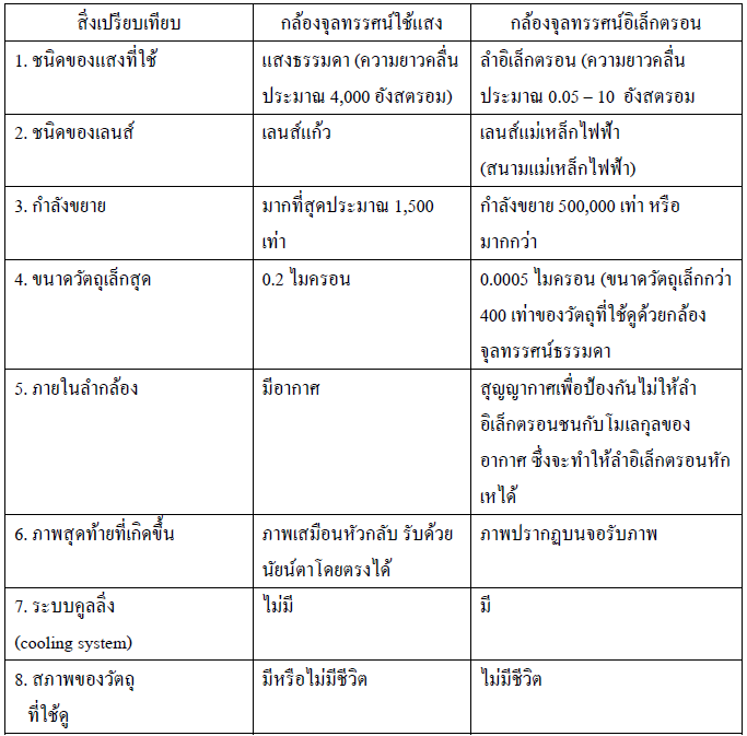 ข้อเปรียบเทียบความแตกต่างระหว่างกล้องจุลทรรศน์ใช้แสงและกล้องจุลทรรศน์อิเล็กตรอน