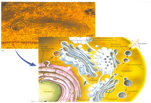 - สร้างเยื่อล้อมรอบโปรตีนและหลุดออกมา เป็นถุง (Secretory vesicle)