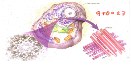 - ประกอบขึ้นจากหลอดโปรตีนไมโครทูบูล (microtubule) จัดเรียงตัวเป็นสูตรรหัส 9 + 0 (nine triplets) |
