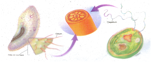 1. เกี่ยวข้องกับการให้กำเนิดซีเลีย และแฟลกเจลลัม โดยโครงสร้างทั้งสองนี้ ประกอบด้วยหลอดไมโครทูบูลจัดเรียงตัวเป็น 9 + 2