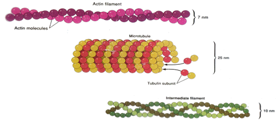 โครงสร้างของ Cytoskeleton 3 ชนิด ซึ่งมีขนาดเส้นผ่านศูนย์กลางต่างกัน