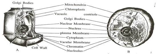 แผนภาพเปรียบเทียบโครงสร้างเซลล์พืช (A) และเซลล์สัตว์ (B) ซึ่งเป็นยูแคริโอติก เซลล์