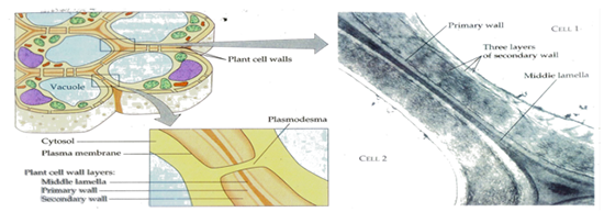 - ประกอบขึ้นจากเซลลูโลส (Cellulose) เป็นสำคัญ สำหรับในพืชและสาหร่าย ส่วนในแบคทีเรียและสาหร่ายสีเขียวแกมน้ำเงิน ขึ้นจากสารเพปทิโดไกลแคน (Peptidoglycan) (สารเชิงซ้อนของคาร์โบไฮเดรตและเพปไทด์)