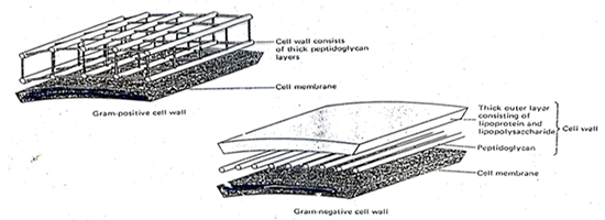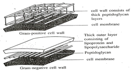แผนภาพแสดงผนังเซลล์ของแบคทีเรียซึ่งเป็นสารเพปทิโดไกลแคนโดยผนังเซลล์ของแบคทีเรียแกรมบวก (Gram-positive cell wall) จะไม่มีชั้นไขมันอยู่ด้านนอก แต่ผนังเซลล์ของแบคทีเรียแกรมลบมีชั้นไขมันอยู่ด้านนอก