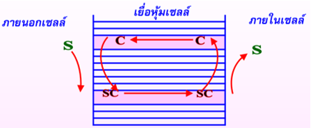 แสดงการเคลื่อนที่ของสาร (S) ผ่านเยื่อหุ้มเซลล์โดยอาศัยตัวพา carrier (C)