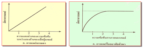 - ดังนั้นความเข้มข้นของสารที่มากกว่าเกินไปจึงไม่ทำให้อัตราการแพร่เร็วขึ้นได้อีก ซึ่งต่างจากการแพร่ธรรมดา ดังกราฟ