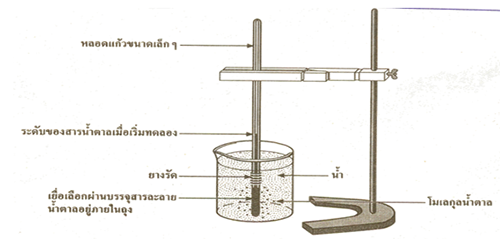 ภาพแสดงการเกิดไดอะไลซิสโดยการแพร่ของโมเลกุลน้ำตาลออกมายังน้ำที่อยู่ภายนอกเยื่อเลือกผ่าน