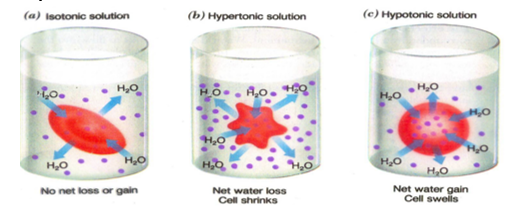 3. สารละลายไอโซโทนิก (isotonic solution) เป็นสารละลายที่มีแรงดันออสโมติกเท่ากับเซลล์ ดังนั้น เซลล์ ไม่เปลี่ยนรูปร่าง