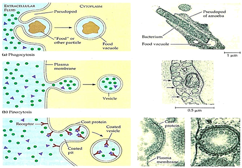 2. การลำเลียงสารโดยไม่ผ่านเยื่อหุ้มเซลล์ – โดยการสร้างถุง จากเยื่อหุ้มเซลล์ มี 3 ลักษณะ คือ