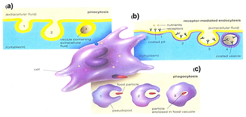 1. Phagocytosis 2. Pinocytosis 3. Receptor mediated endocytosis