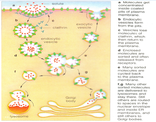 การนำสารเข้าในเซลล์โดยอาศัยตัวรับ (Receptor) เป็นตัวกลางที่เยื่อหุ้มเซลล์ เช่น การนำอนุภาคไลโปโปรตีนเข้าในเซลล์จะต้องอาศัยตัวรับที่เยื่อหุ้มเซลล์ และสารที่ช่วยทำให้เกิดถุงคือ คลาทริน (Clathrin) ที่เยื่อหุ้มเซลล์เช่นกัน เมื่อเกิดเป็นถุงผิวหยาบ (Coated vesicle) ภายในไซโทพลาสซึมของเซลล์แล้ว คลาทรินจะหลุดออกไปเป็นโมเลกุลเดี่ยวๆ (Clathrin triskelions) และถุงผิวหยาบจะกลายเป็นถุงผิวเรียบ (Uncoated vesicle) เรียกเอนโดโซม (Endosome) หลังจากนั้นจะมีถุงบรรจุสารที่มี pH ต่ำประมาณ 5.0 เข้ารวมกับเอนโดโซม เพื่อทำให้ตัวรับแยกตัวออกมากลับไปเป็นตัวรับที่เยื่อหุ้มเซลล์ใหม่ หลังจากนั้น ถุงเอนโดโซมที่บรรจุไลโปโปรตีนจะถูกย่อยโดยน้ำที่ย่อยจากไลโซโซมกลายเป็นสารโมเลกุลเดี่ยวภายในไซโทพลาสซึม