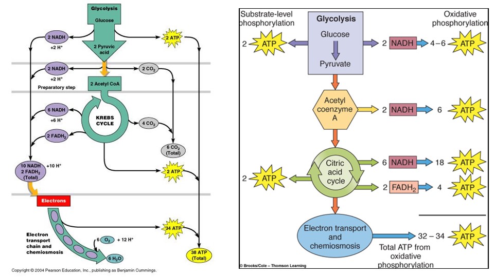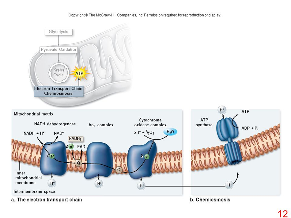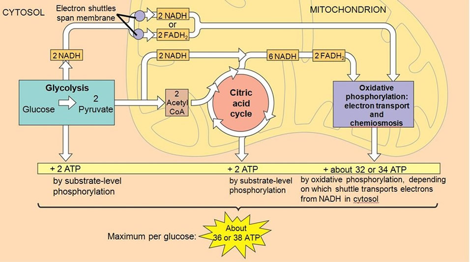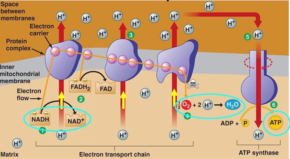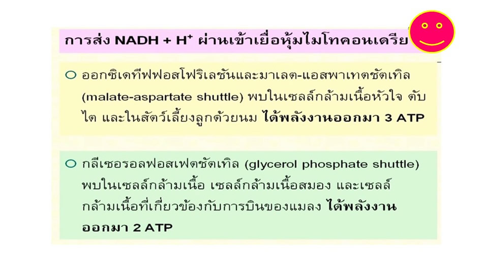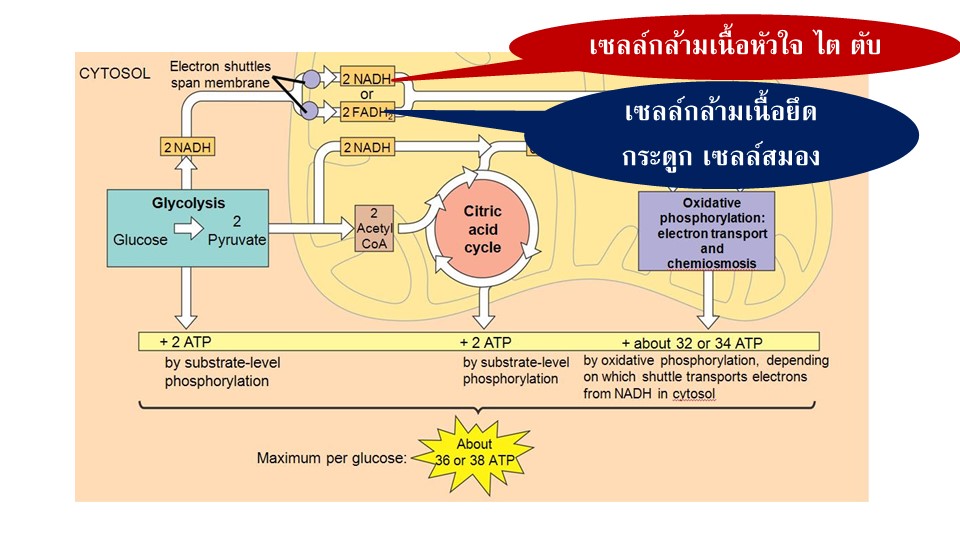 * การสร้าง ATP แบบนี้เรียกว่า Oxidative Phosphorylation * การนำความเข้มข้นของ H+ มาใช้ประโยชน์ เรียกว่า Chemiosmosis - 1 NADH นำมาสร้าง ATP ได้ 3 ATP - 1 FADH2 นำมาสร้าง ATP ได้ 2 ATP