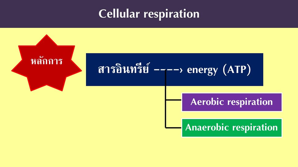 Cellular respiration การสลายสารอาหารระดับเซลล์ เป็นกระบวนการที่เปลี่ยนพลังงานของพันธะเคมีของสารอาหารให้มาอยู่ในรูปสารประกอบพลังงานสูง มี 2 รูปแบบ คือ - Aerobic respiration - Anaerobic respiration (Fermentation) Aerobic respiration คือ กระบวนการสลายสารอาหารแบบใช้ออกซิเจน เป็นการสลายสารอินทรีย์ Organic compounds (food) + Oxygen CO2 + H2O + energy ประกอบด้วย 3 ขั้นตอน 1. Glycolysis 2. Krebs cycle 3. Electron transport chain โดยทั่วไป cellular respiration จะอธิบายถึง Oxidation ของ glucose
