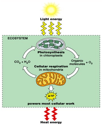 การสลายอาหารระดับเซลล์ (Cellular respiration) การเปลี่ยนรูปพลังงานและการหมุนเวียนสารเคมีในระบบนิเวศ Chloroplast และ mitochondria เป็น organelles ที่เปลี่ยนพลังงานรูปหนึ่งไปเป็นอีกรูปหนึ่ง - Chloroplast - mitochondria