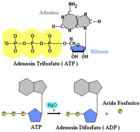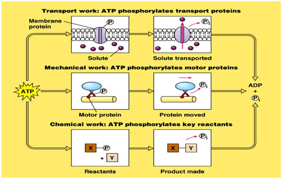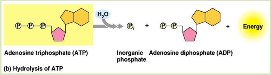 การตัดหมู่ฟอสเฟตออกจากสารตั้งต้น เมื่อ P สลายภายในเซลล์ พลังงานบางส่วนจะสูญเสียไปในรูปของความร้อน และบางส่วนถูกนำไปใช้ทำงาน เมื่อ ATP ถ่ายทอด P ให้กับโมเลกุลของสารอื่น โมเลกุลของสารนั้นจะได้พลังงานเพิ่มขึ้นด้วย ทำให้เกิดปฏิกิริยากับโมเลกุลอื่นต่อไป ดังนั้นพลังงานจาก ATP สามารถทำให้เกิดปฏิกิริยาเคมีภายในเซลล์