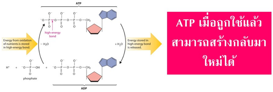 กระบวนการสร้าง ATP จาก ADP และหมู่ P เรียกว่า กระบวนการฟอสโฟรีเลชัน (Phosphorylation)