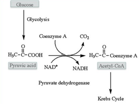 เป็นสารเริ่มต้นของ Krebs cycle เกิดที่ Matrix เป็นการทำให้ Pyruvate (C 3 อะตอม) จากกระบวนการ Glycolysis แต่ละโมเลกุลเหลือเป็นสาร C 2 อะตอม มี CO2 หลุดออกมา 1 โมเลกุล พร้อมกับ e- โดยมี NAD+ มารับ e- เก็บเอาไว้เปลี่ยนเป็น NADH coenzyme A เป็น coenzyme ชนิดหนึ่ง ซึ่งมีวิตามิน pantothenic acid เป็นองค์ประกอบ
