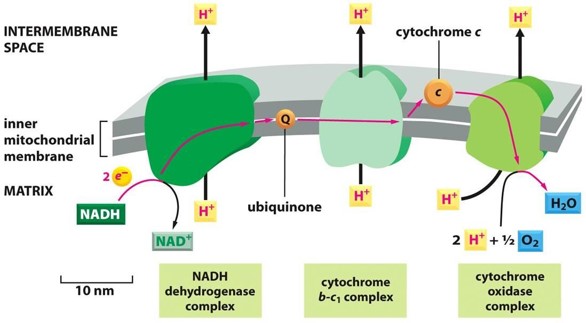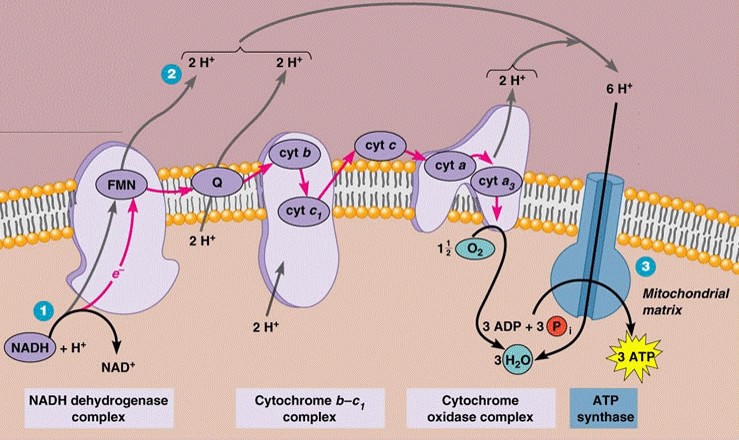 1. NADH dehydrogenase complex 2. cytochrome b-c1 complex 3. cytochrome oxidase complex