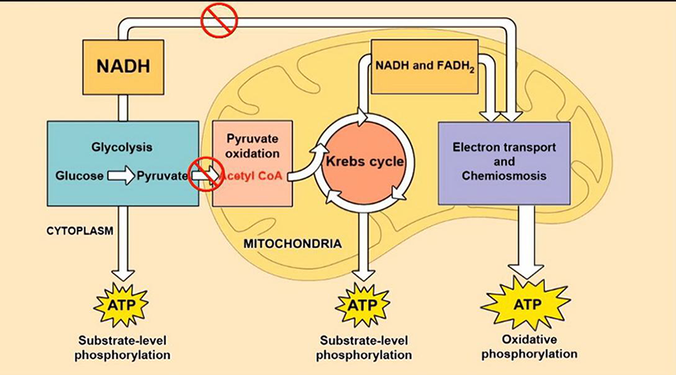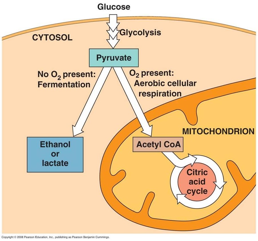 ในสภาวะที่ไม่มี O2 ไพรูเวตและ NADH จะไม่ถูกส่งเข้าไปในไมโทคอนเดรีย เซลล์จะมีการสลายไพรูเวตโดยกระบวนการหมัก (fermentation) คือ การหมักกรดแลกติก (lactic acid fermentation) และการหมักแอลกอฮอลล์ (alcohol fermentation)