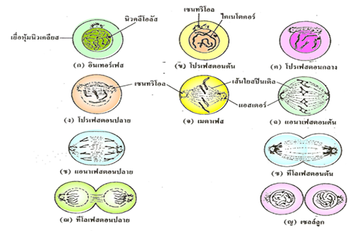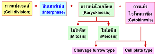 - ประกอบด้วยการเตรียมตัว ให้พร้อมที่จะแบ่งตัว และกระบวนการแบ่งเซลล์