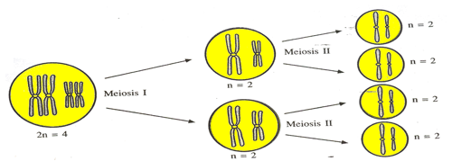 - มีการลดจำนวนชุดโครโมโซมจากดิพลอยด์ไปเป็นแฮพลอยด์ (2n n) ซึ่งเป็นกลไกหนึ่งที่ช่วยให้จำนวนชุดโครโมโซมคงที่ ในแต่ละสปีชีส์ ไม่ว่าจะเป็นโครโมโซม ในรุ่นพ่อ-แม่ หรือรุ่นลูก-หลานก็ตาม