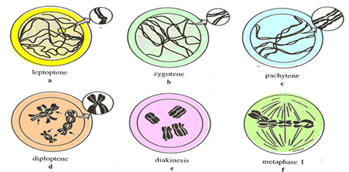 1. ไมโอซิส I (Meiosis - I หรือ First meiotic division) ไมโอซิส I (Meiosis - I) หรือ Reductional division ขั้นตอนนี้จะมีการแยก homologous chromosomeออกจากกันมี 5 ระยะย่อย คือ