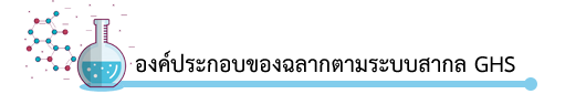 1. รูปสัญลักษณ์แสดงความเป็นอันตราย (Hazard pictogram) เป็นสัญลักษณ์สีดำบนพื้นขาวอยู่ภายในกรอบสีแดงรูปสี่เหลี่ยมข้าวหลามตัด มีทั้งหมด 9 รูปสัญลักษณ์ เพื่อสื่อความหมายของความเป็นอันตรายในแต่ละด้าน และแต่ละประเภท 2. คำสัญญาณ (Signal word) มี 2 คำสัญญาณ คือ “อันตราย” และ “ระวัง’’ 3. ข้อความแสดงความเป็นอันตราย (Hazard statement) เป็นการอธิบายความเป็นอันตรายของสารเคมี เช่น ละอองลอยไวไฟ เป็นอันตรายเมื่อกลืนกิน ทำให้ผิวหนังไหม้อย่างรุนแรง และทำลายดวงตาเป็นต้น 4. ข้อความและรูปสัญลักษณ์แสดงข้อควรระวัง (Precautionary statement and pictogram) ประกอบด้วยคำเตือน และข้อควรปฏิบัติเพื่อป้องกันอันตราย เก็บรักษา การกำจัด และจัดการเมื่อมีเหตุฉุกเฉิน เช่น ใช้ในที่อากาศถ่ายเทสะดวก เก็บให้ห่างจากเด็ก ห้ามนำภาชนะกลับมาใช้อีก หากถูกผิวหนังให้ล้างออกด้วยน้ำสะอาด เป็นต้น 5. ตัวบ่งชี้ผลิตภัณฑ์ (Product identifier) ชื่อผลิตภัณฑ์ ชื่อสารเคมีที่เป็นสารสำคัญ หรือสารอันตรายในผลิตภัณฑ์ และปริมาณความเข้มข้น 6. การระบุผู้ผลิตหรือผู้จัดจำหน่าย (Supplier identification) ต้องมีชื่อที่อยู่ และหมายเลขโทรศัพท์ของผู้ผลิตหรือผู้จัดจำหน่าย หรือหมายเลขโทรศัพท์ฉุกเฉินบนฉลาก 7. ข้อมูลเพิ่มเติมอื่น ๆ (Supplementary information)