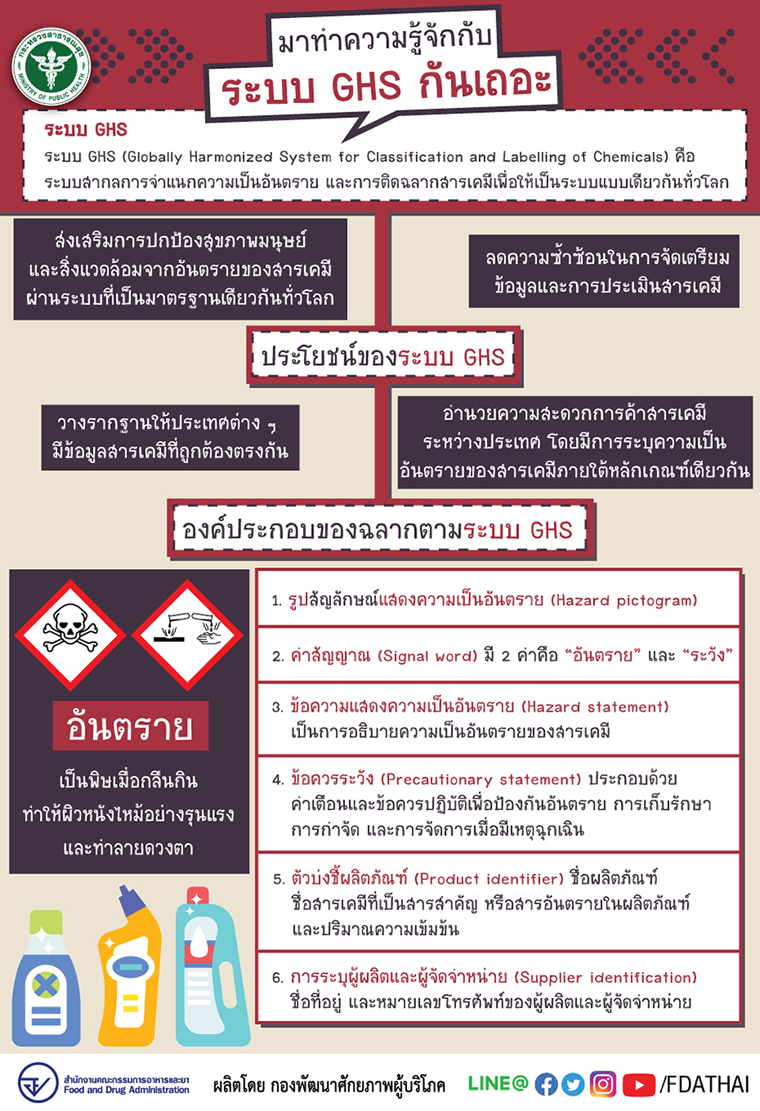 GHS (Globally Harmonised System for Classification and labeling of Chemicals) เป็นระบบการจัดกลุ่มสารเคมี การติดฉลาก และการแสดงรายละเอียดบนเอกสารข้อมูลความปลอดภัย (Safety Data Sheet : SDS) เพื่อให้แต่ละประเทศสามารถสื่อสารและเข้าใจข้อมูลที่เกี่ยวข้องกับอันตรายที่เกิดจากสารเคมีในทิศทางเดียวกัน ซึ่งจะช่วยลดความซ้ำซ้อนและค่าใช้จ่ายในการทดสอบและประเมินสารเคมี ตลอดจนสร้างความเชื่อมั่นว่าการใช้สารเคมีแต่ละประเภทจะถูกต้องตามวัตถุประสงค์ โดยไม่เกิดผลเสียหรืออันตรายต่อสุขภาพมนุษย์และสิ่งแวดล้อมแต่อย่างใด