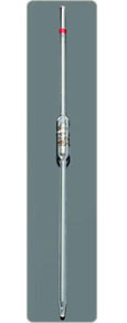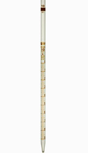 2. Serological pipette ปิเปตชนิดนี้มีลักษณะคล้าย graduated pipette แต่ปิเปตชนิดนี้มีขีดแบ่งย่อยบอกปริมาตรไว้จนถึงปลายปิเปต มีทั้งชนิดที่ต้องเป่าหยดสุดท้ายและไม่ต้องเป่า ถ้าเป็นชนิดที่ต้องเป่าจะมีสัญลักษณ์เป็นวงฝ้าทึบอยู่ตรงปลายที่ใช้ดูด แต่ถ้าไม่มีสัญลักษณ์เหล่านี้ เวลาใช้ต้องปล่อยให้สารละลายไหลออกไปจากปิเปตจนหมด โดยแตะปลายของปิเปตกับผิวด้านในของภาชนะที่รองรับ ห้ามเป่าถึงแม้จะมีสารละลายค้างอยู่ในส่วนปลายบ้างก็ตาม 3. Ostwald pipette ปิเปตชนิดนี้เป็นชนิดพิเศษที่ผลิตขึ้นเพื่อวัดปริมาตรของของเหลวที่มีความหนืด เช่น เลือด ซีรั่ม มีลักษณะคล้าย volumetric pipette แต่กระเปาะของปิเปตชนิดนี้อยู่ใกล้ปลายที่ปล่อยของเหลวออกมากกว่า ซึ่งจะช่วยลดความผิดพลาดอันอาจจะเกิดขึ้น เนื่องจากความหนืดของของเหลว Ostwald pipette เป็นชนิดที่ต้องเป่าออก ดังนั้นจะมีแถบหรือวงฝ้าทึบอยู่ใกล้ปลายปากดูดเป็นสัญลักษณ์ไว้ เวลาถ่ายของเหลวออกควรให้ของเหลวไหลออกช้าที่สุดเท่าที่จะช้าได้ เพื่อให้ของเหลวเหลือในปิเปตน้อยที่สุด จึงจะได้ปริมาตรที่ใกล้เคียงกับความจริง 4. Volumetric pipette ปิเปตชนิดนี้ใช้วัดปริมาตรที่กำหนดเพียงปริมาตรเดียว ไม่ มีขีดแบ่งส่วนย่อยเหมือนสองชนิดแรก มีลักษณะเป็นกระเปาะอยู่ตรงกลาง มีขีดบอกปริมาตรอยู่เหนือกระเปาะใกล้ปลายปากดูด การวัดจะถูกต้องเมื่อปล่อยให้สารละลายไหลออกช้าๆ จนหมดแล้วแตะปิเปตกับผิวด้านในของภาชนะที่รองรับโดยไม่ต้องเป่า แม้จะมีสารละลายเหลืออยู่ที่ปลายของปิเปตบ้างก็ตาม