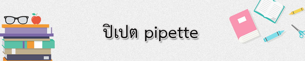 5. Pasteur pipette ปิเปตชนิดนี้ ไม่ใช้วัดปริมาตร แต่ใช้ในการถ่ายของเหลวจากภาชนะหนึ่งไปยังอีกภาชนะหนึ่งเพราะไม่มีขีดบอกปริมาตร เวลาใช้ต้องต่อกับลูกยางขนาดเล็ก ปิเปตต์ชนิดนี้จะมีปลายล่างเรียว เพื่อให้สารละลายไหลออกอย่างช้า ๆ ปลายบนมีรอยคอด ซึ่งมีไว้เพื่อกันไม่ให้สารละลายถูกดูดเลยเข้าไปในลูกยาง นิยมใช้ปิเปตชนิดนี้ในการดูดส่วนใสของสารละลายเพื่อแยกจากตะกอน หรือใช้ในการละลายตะกอน รวมทั้งปรับปริมาตรของสารละลายเมื่อใกล้ถึงขีดบอกปริมาตร 6. Contain pipette เป็นปิเปตต์ที่ให้ความแม่นยำสูงหากใช้โดยวิธีที่ถูกต้อง ปิเปตต์ชนิดนี้มีขีดบอกปริมาตรตามที่กำหนด มักใช้ในงานที่ต้องการปริมาณน้อย ๆ เช่น micropipette การใช้ปิเปตต์ชนิดนี้เมื่อปล่อยสารตัวอย่างลงในภาชนะที่รองรับแล้ว ต้องดูดสารละลายสำหรับเจือจาง (diluent) ขึ้นลงหลาย ๆ ครั้ง เพื่อชะสารตัวอย่างในปิเปตต์ออกให้หมด จึงจะได้ปริมาตรที่ถูกต้อง 7. ปิเปตอื่นๆ ปัจจุบันมีเครื่องมือหลายชนิดที่ใช้ตวงปริมาตรและช่วยอำนวยความสะดวกใน งานที่จำเป็นต้องตวงปริมาตรจำนวนน้อย ๆ หลาย ๆ ครั้ง ที่สำคัญ ได้แก่ เทคนิคที่ถูกต้องในการใช้ปิเปตมีวิธีการดังนี้ 2. เมื่อจะนำปิเปตที่เปียกไปใช้วัดปริมาตร ต้องล้างปิเปตด้วยสารละลายที่จะวัด 2-3 ครั้ง โดยใช้สารละลายครั้งละเล็กน้อยและให้สารละลายถูกผิวแก้วโดยทั่วถึง แล้วเช็ดปลายปิเปตด้วยกระดาษ tissue ที่สะอาด 3. จุ่มปลายปิเปตลงในสารละลายที่จะวัดปริมาตร โดยที่ปลายปิเปตอยู่ต่ำกว่าระดับสารละลายตลอดเวลาที่ทำการดูด เพราะเมื่อใดที่ระดับของสารละลายในภาชนะลดลงต่ำกว่าปลายปิเปตในระหว่างที่ทำการดูด สารละลายในปิเปตจะพุ่งเข้าสู่ปากทันที 4. ใช้ปากดูดหรือเครื่องดูดหรือกระเปาะยางดูดสารละลายเข้าไปในปิเปตอย่างช้าๆ จนกระทั่งสารละลายขึ้นมาอยู่เหนือขีดบอกปริมาตร และใช้นิ้วชี้ปิดปลายปิเปตให้แน่นโดยทันที จับก้านปิเปตด้วยนิ้วหัวแม่มือและนิ้วกลาง (ไม่ควรใช้ปากดูด ถ้าสารละลายนั้นเป็นสารที่มีพิษ หรือเป็นกรดแก่ ด่างแก่ ต้องใช้เครื่องดูดหรือกระเปาะยางต่อตอนบนของปิเปต) 5. จับปิเปตให้ตั้งตรง แล้วค่อย ๆ ผ่อนนิ้วชี้เพื่อให้สารละลายที่เกินขีดบอกปริมาตรไหลออกไป จนกระทั่งส่วนเว้าต่ำสุดของสารละลายแตะกับขีดบอกปริมาตรพอดี ปิดแน่นด้วยนิ้วชี้และ แตะปลายปิเปตกับข้างภาชนะที่ใส่สารละลาย เพื่อให้หยดน้ำซึ่งอาจจะติดอยู่ที่ปลายปิเปตหมดไป จับปิเปตให้ตรงประมาณ 30 วินาที เพื่อให้สารละลายที่ติดอยู่ข้างๆ ปิเปตไหลออกหมด ขอบคุณเนื้อหาเพิ่มเติม |