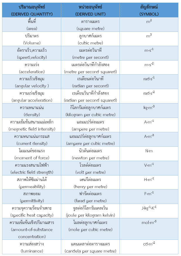 หน่วยอนุพัทธ์เอสไอ (SI DERIVED UNITS) หน่วยอนุพัทธ์ คือหน่วยของการวัดของปริมาณอนุพัทธ์ในระบบของปริมาณที่กำหนด หน่วยอนุพัทธ์เอสไออนุพัทธ์มาจากหน่วยฐานเอสไอ โดยเป็นไปตามการเชื่อมโยงทางกายภาพ (physical connection) ระหว่างปริมาณฐาน ตัวอย่าง จากความเชื่อมโยงทางกายภาพระหว่างปริมาณของความยาวที่วัดในหน่วยเมตร และปริมาณของเวลาที่วัดในหน่วยวินาที สามารถอนุพัทธ์ปริมาณอัตราเร็วได้ในหน่วย เมตรต่อวินาที หน่วยอนุพัทธ์แสดงไว้ในรูปแบบของหน่วยฐาน โดยการใช้สัญลักษณ์ทางคณิตศาสตร์ คือ สัญลักษณ์คูณ และสัญลักษณ์หาร ตัวอย่างแสดงไว้ในตารางที่ 2