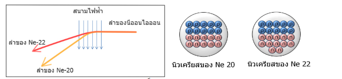 ในปี 1912 ทอมสัน และผู้ช่วยวิจัยชื่อ Francis William Aston ร่วมกันศึกษาการกระเจิงของลำประจุบวกของธาตุนีออนในสนามไฟฟ้าและสนามแม่เหล็ก พวกเขาได้พบว่าลำของนีออนที่มีประจุบวกแยกออกเป็นสองลำ หลังจากเคลื่อนที่ผ่านสนามไฟฟ้าหรือสนามแม่เหล็ก การที่ลำของนีออนแยกออกเป็นสองลำนี้แสดงให้เห็นว่า ธาตุนีออนที่เคลื่อนที่เป็นลำทั้งสองลำมีมวลไม่เท่ากัน (เพราะมีจำนวน Neutron ไม่เท่ากัน) ทำให้มีความเร่งอันเนื่องจากสนามไฟฟ้าหรือสนามแม่เหล็กไม่เท่ากันและเคลื่อนที่แยกออกจากกันในที่สุด และนี้คือการค้นพบไอโซโทปทั้งสองไอโซโทปของธาตุนีออน ซึ่งก็คือ Ne-20 และ Ne-22 และหลังจากนั้น หลอดรังสีที่ดูการเคลื่อนที่ของประจุบวกนี้คือตัวอย่างแรก ๆ ของเครื่อง Mass spectroscopy ซึ่งได้มีการปรับปรุงและพัฒนาต่อโดย Francis William Aston และ Arthur Jeffrey Dempster
