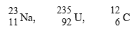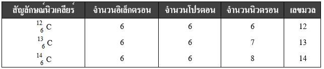 จะเห็นได้ว่า คาร์บอนทั้ง 3 ชนิด มีอิเล็กตรอน การอ่านชื่อไอโซโทป ให้เรียกชื่อธาตุ แล้วตามด้วยเลขมวล เช่น 126C อ่านว่า คาร์บอน 12 136C อ่านว่า คาร์บอน 13 146C อ่านว่า คาร์บอน 14 ปัจจุบันมีการใช้ไอโซโทป เพื่อประโยชน์ในทางด้านต่าง ๆ มากขึ้น เช่น ใช้ 126C เป็นมาตรฐานเปรียบในการหามวลอะตอมของธาตุต่างๆ ใช้ 146C บอกอายุของวัตถุโบราณ และใช้สำหรับศึกษากลไกของการเกิดปฏิกิริยาเคมี ใช้ 24Na ในการแพทย์เพื่อตรวจวงจรของโลหิต ใช้ 60Co สำหรับเป็นแหล่งกำเนิดรังสีแกมมา เพื่อประโยชน์ทางการแพทย์ คือใช้รักษาโรคมะเร็ง ใช้ 13I สำหรับตรวจอาการผิดปกติขอวต่อมไทรอยด์ เป็นต้น ไอโซโทน (Isotone) หมายถึง ธาตุต่างชนิดกันที่มีจำนวนนิวตรอนเท่ากัน แต่มีเลขมวลและเลขอะตอมไม่เท่ากัน เช่น 188O, 199F เป็นไอโซโทนกัน มีนิวตรอนเท่ากันคือ n = 10
