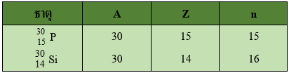 จะเห็นได้ว่าเฉพาะ n เท่านั้นที่เท่ากัน แต่ A และ Z ไม่เท่ากัน จึงเป็นไอโซโทน ไอโซบาร์ (Isobar) หมายถึง ธาตุต่างชนิดกันที่มีเลขมวลเท่ากัน แต่มีมวลอะตอมและจำนวนนิวตรอนไม่เท่ากัน เช่น มีเลขมวลเท่ากันคือ 30