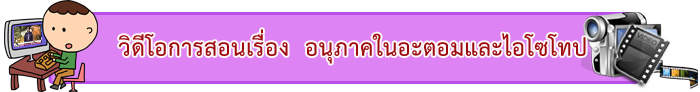 ไอโซโทป (Isotope) หมายถึง อะตอมของธาตุชนิดเดียวกันที่มีโปรตอนเท่ากัน (หรืออิเล็กตรอนเท่ากัน ) แต่มีเลขมวลและจำนวนนิวตรอน 11H เรียกว่า โปรเตรียม ใช้สัญลักษณ์ H แทน 11H 21H เรียกว่า ดิวทีเรียม ใช้สัญลักษณ์ D แทน 21H 31H เรียกว่า ตริเตรียม ใช้สัญลักษณ์ T แทน 31H อะตอมของธาตุชนิดเดียวกันจะมีจำนวนโปรตอนและอิเล็กตรอนเท่ากัน แต่จำนวนนิวตรอนอาจจะไม่เท่ากันก็ได้ ซึ่งมีผลทำให้มวล